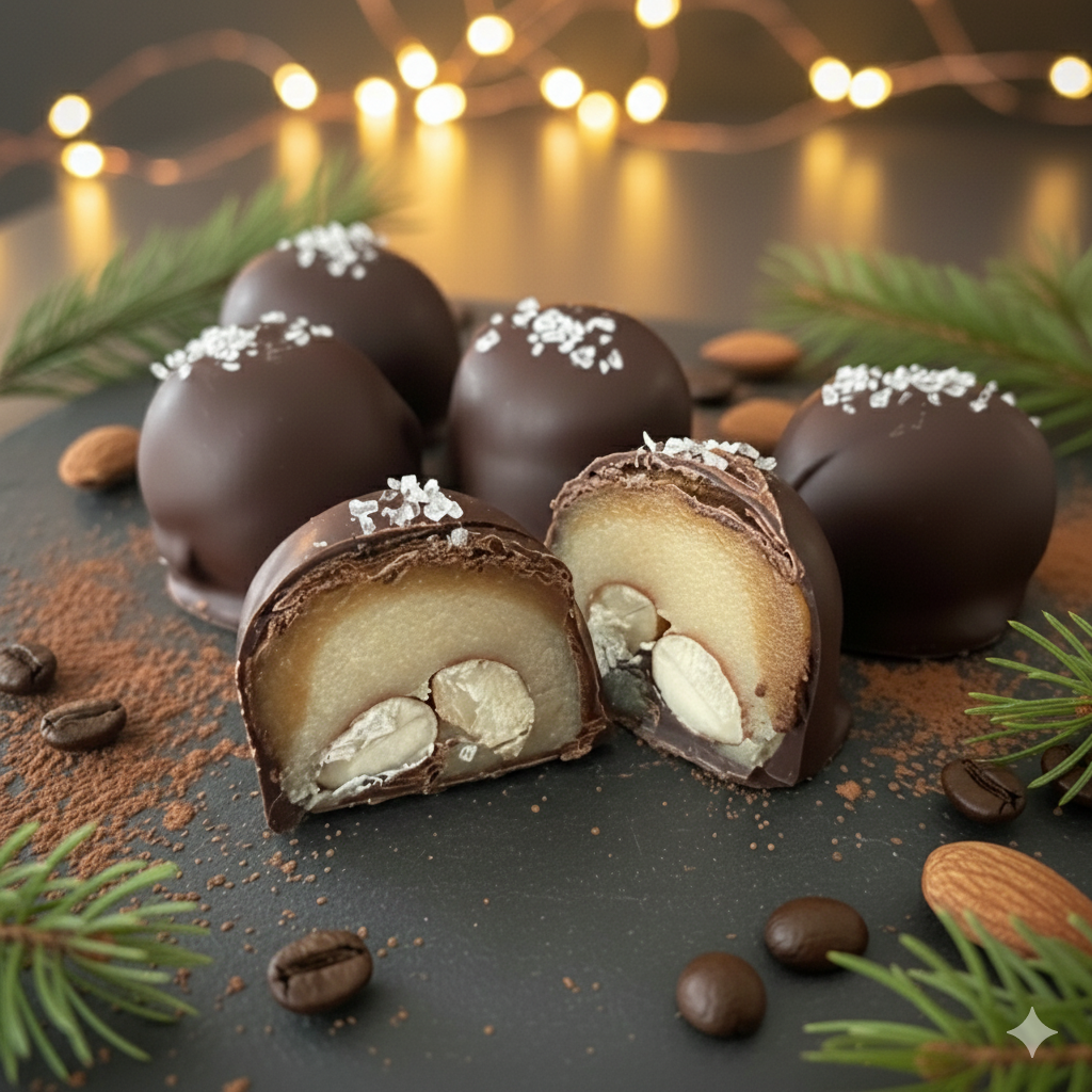 The original 12-piece Black Diamond Signature Box delivers rich layers of marzipan, golden caramel, and roasted salted almonds—all enrobed in 70% Belgian dark chocolate and finished with a delicate sprinkle of sea salt.